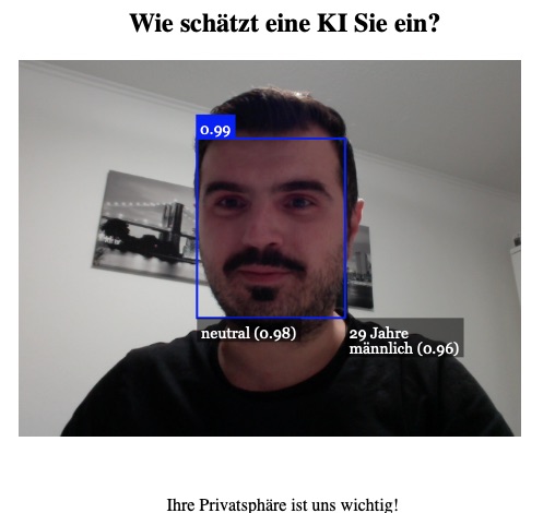 Direkt im Browser, ohne zusätzliche Software und ohne eine Cloud-Anbindung wird das trainierte KI-Modell Ihr Gesicht erkennen und das Alter, das Geschlecht und die Stimmung abschätzen. Die Trefferquote ist ziemlich gut.